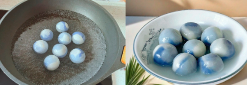 Từng miếng bánh trôi với màu xanh hoa đậu vô cùng đẹp mắt rất kích thích vị giác. Bánh có vỏ ngoài dẻo, mềm, bên trong phần nhân mè rang ngọt nhẹ lại thơm ngậy rất ngon miệng. Món bánh trôi hoa đậu biếc rất đáng để bạn thử làm cho ngày Tết Hàn thực.