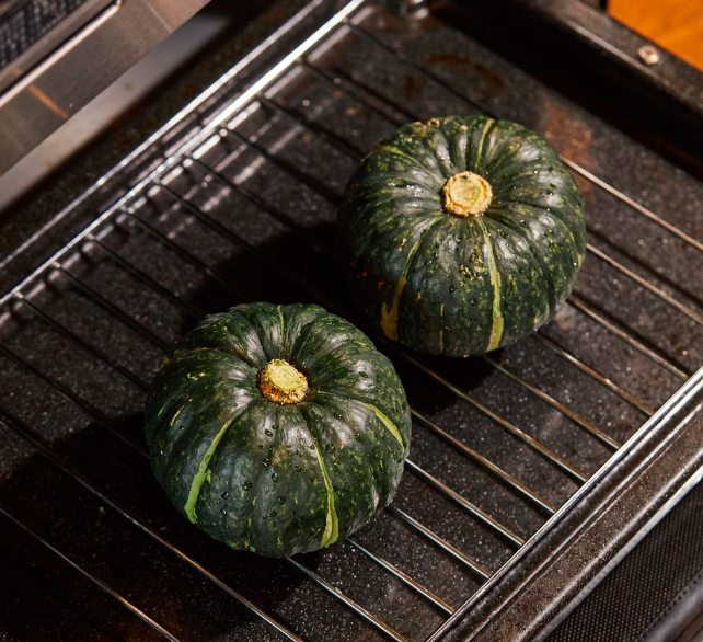 Sau khi tạo hình xong, bạn cho bí đỏ non lên vỉ nướng và nướng thêm 5 phút nữa. Dùng lò nướng bạn có thể để ở nhiệt độ 160 độ C.