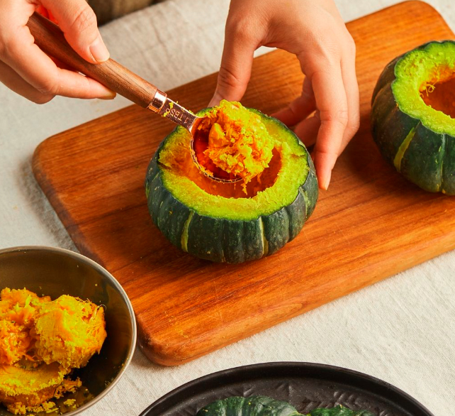 Sau khi nướng, mang bí ra, dùng dao khéo léo cắt phần đầu. Dùng thìa hoặc dụng cụ nạo bỏ phần ruột.