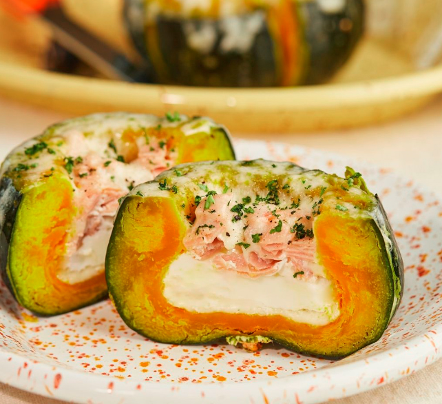 Bí ngô xanh ruột vàng chứa nhiều chất xơ và ít calo nên chúng cũng là thực phẩm giữ dáng hiệu quả. Kết hợp với các thực phẩm giàu protein như trứng và phô mai sẽ giúp tăng thêm mức độ bổ dưỡng. Món ăn này đạt được 3 tiêu chí: đẹp mắt, thơm ngon và giàu dinh dưỡng.