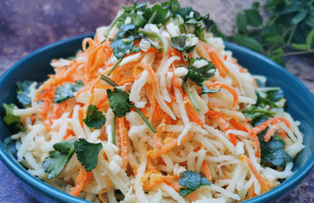 Cuối cùng, bạn thêm chút muối, tỏi băm, rau mùi và dầu mè vào, dùng đũa đảo nhẹ khoai tây và cà rốt thái sợi hấp, trộn đều để các nguyên liệu quện vào là có thể ăn được.
