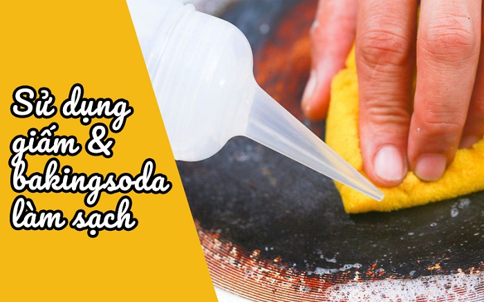 Ngoài việc sử dụng baking soda bạn cũng có thể sử dụng giấm ăn để loại bỏ vết cháy bằng cách nhỏ giấm lên những vết cháy và kì cọ bằng miếng chà nồi. Giấm có tính axít nên có thể loại bỏ một số vết cháy cứng đầu.
