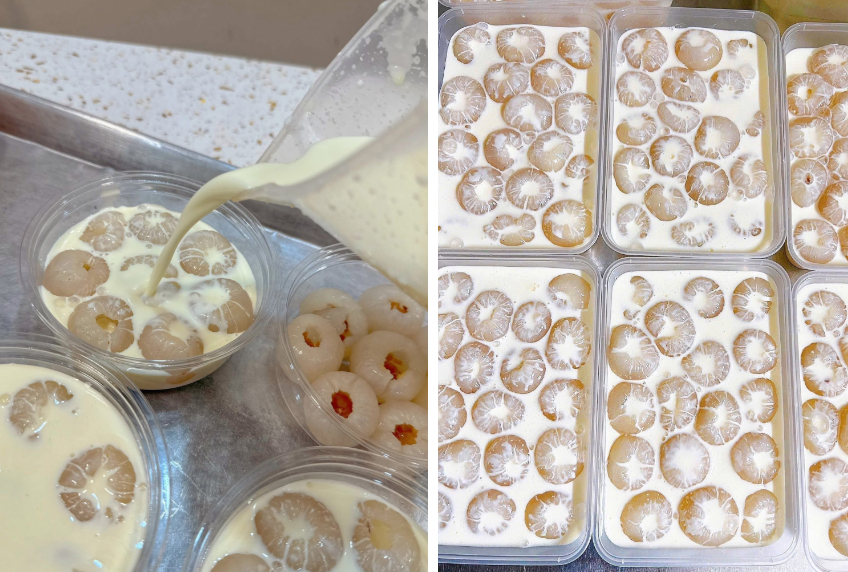 Cho vào bát cùng với vải thiều, chan nước vải mát vào.