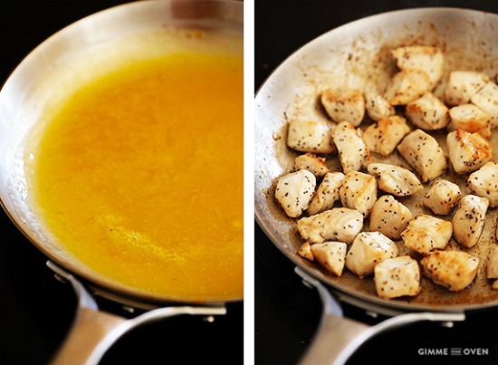 – Thêm gà vào chảo và đảo đều tay cho đến khi từng miếng thịt gà được phủ một lớp nước sốt đặc sệt.