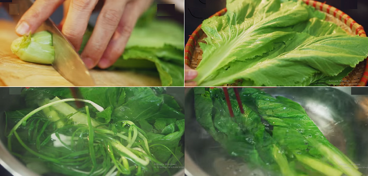• Cho cải bẹ xanh và hành lá vào nồi nước đang sôi, trần qua rồi vớt ra cho ngay vào thau nước đá để giữ màu xanh của cải và hành.
