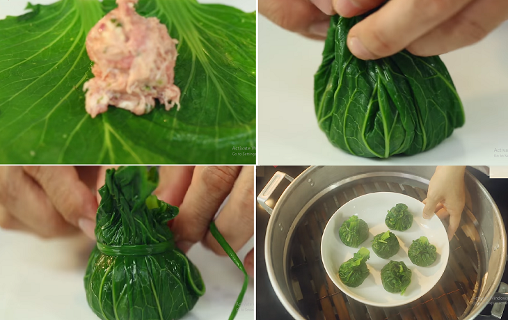 Cuộn nhân thịt vào trong lá cải, dùng hành lá buộc chặt rồi hấp chín