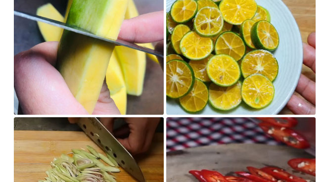 Bạn cho chân gà ra tô thêm phần nước sốt vào trộn đều lên, tiếp theo bạn cho lần lượt từng nguyên liệu xoài, tắc, sả vào trộn đều trước khi thêm vào nguyên liệu mới, khi trộn đều các nguyên liệu thì bạn ướp hỗn hợp chân gà trong 15 phút.