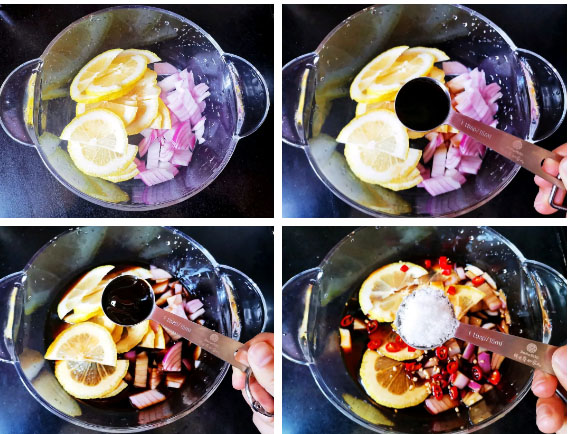 Bước 2: Chanh bạn đem cắt dọc làm đôi sau đó thái lát mỏng. Hành tây cắt miếng nhỏ. Cho hành và chanh vào âu rồi thêm 5 thìa nước tương và 7 thìa giấm đen. Sau đó bạn cho thêm 1 thìa tinh chất gà, 2 thìa đường, cùng ớt xắt nhuyễn và tỏi băm vào, trộn đều tất cả các nguyên liệu.