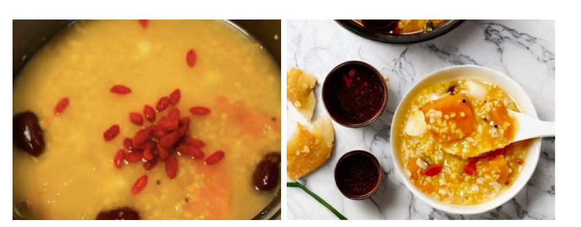 Cháo ngũ cốc bí đỏ và củ mài với hương vị mềm, ngọt và các dưỡng chất tự nhiên có thể xua tan cái lạnh và làm dịu dạ dày mệt mỏi, là món quà hoàn hảo cho sức khỏe của phụ nữ trung niên và cao tuổi trong mùa đông này. Món ăn này vừa ngon, lại bổ dưỡng, ấm bụng, tốt cho sức khỏe, mà công thức cực kỳ đơn giản. Cả người lớn lẫn trẻ nhỏ đều sẽ tranh nhau thưởng thức cho mà xem. Bí đỏ có tính vị ngọt, tính ôn, đi vào kinh tỳ và vị, giúp kiện tỳ, ích khí, điều hòa chức năng tiêu hóa. Đây là thực phẩm hữu ích cho các trường hợp tỳ vị hư nhược, ăn uống kém, đầy trướng bụng, mệt mỏi và giúp phòng ngừa táo bón do giàu chất xơ. Củ mài rất giàu chất nhầy và tinh bột, có thể thúc đẩy quá trình tiêu hóa và hấp thu ở đường tiêu hóa, đối với người bị khó chịu đường tiêu hóa và tỳ hư có tác dụng điều hòa rất tốt.