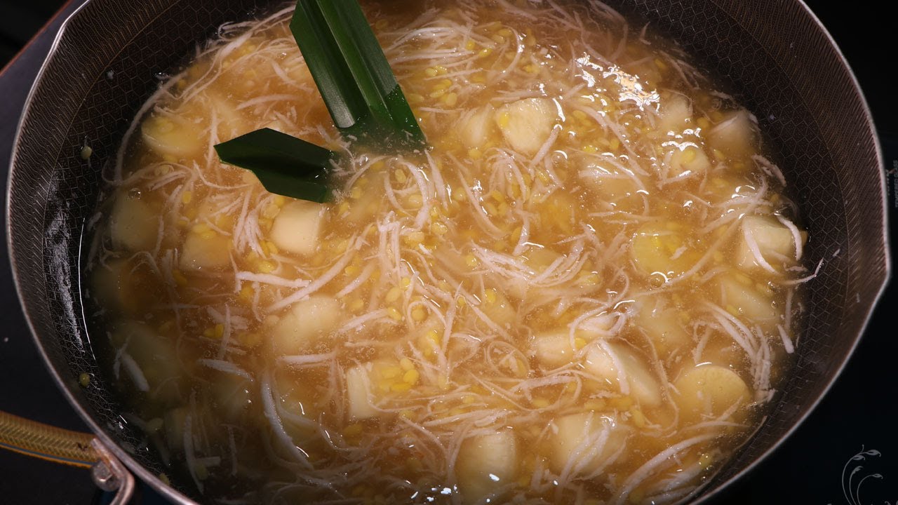 Đun sôi 1,5 lít nước, cho đậu xanh và lá dứa vào nấu với lửa nhỏ đến khi đậu xanh chín bở.