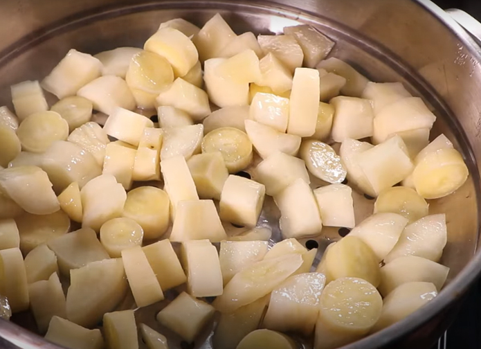 Sắn gọt vỏ, rửa sạch, cắt miếng vừa ăn rồi ngâm trong nước muối loãng khoảng 3-4 tiếng để loại bỏ độc tố.