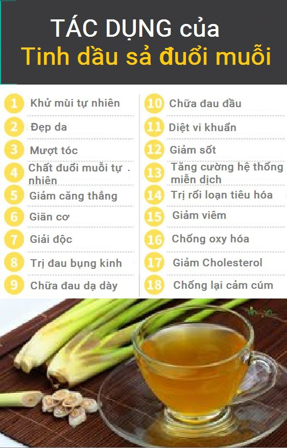 Tinh dầu sả có mùi nặng hợn cây sả thường, hiệu quả đuổi muỗi cũng tốt hơn. Hương thơm của tinh dầu sả đem đến cho người sử dụng cảm giác thoải mái. Khiến lũ muỗi cảm thấy khó chịu và tránh xa chúng ta. Cách chế biến tinh dầu sả không hề khó, chỉ cần bạn tỉ mỉ và khéo léo một chút thì sẽ tự mình tạo ra được những thành phẩm tuyệt vời. Đặc biệt, chiết xuất tinh dầu sả là sản phẩm tự nhiên chống lại muỗi hiệu quả cao. Và đặc biệt an toàn cho trẻ em và phụ nữ mang thai sử dụng.