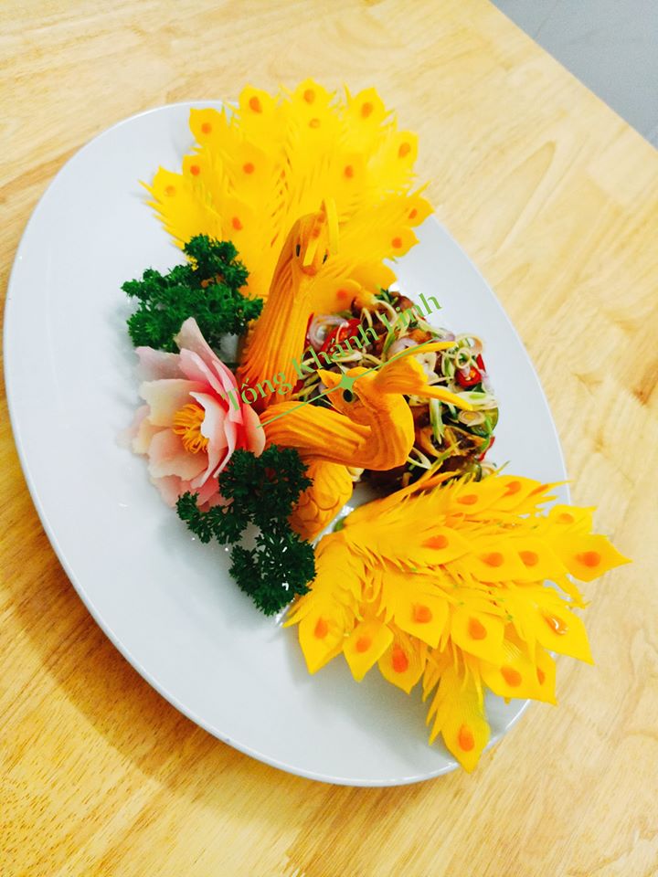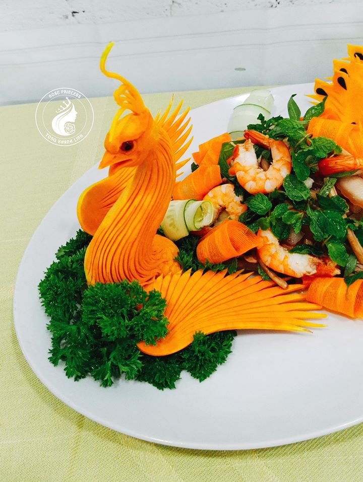Món gỏi tôm kiểu Thái được chị Khánh Linh trình bày theo hình chim phụng.