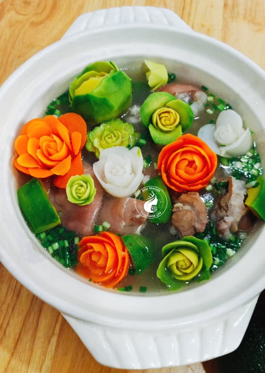 Ai ngắm món canh này cũng chép miệng nói rằng mình cầu kỳ quá, mất thời gian. Nhưng không, mình làm nhanh lắm. Trong khi ngồi chờ giò heo chín mềm, mình ngồi tỉa củ cải, cà rốt, bơ Pink thành những bông hoa.