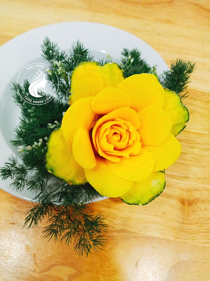 Chị Khánh Linh rất thích tỉa hoa từ những loại rau củ, hoa quả. Trước kia thì chị hay làm hoa hồng từ tất cả các nguyên liệu như thịt, cá, trứng, bánh,... Thế rồi chị có đam mê điêu khắc hoa từ các loại củ, quả lúc nào cũng không hay.