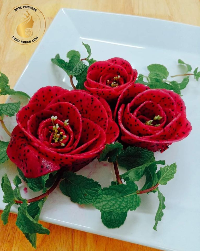 Không những biết tỉa hoa từ rau củ mà chị Khánh Linh còn biết làm cánh hoa từ hoa quả rất đẹp.