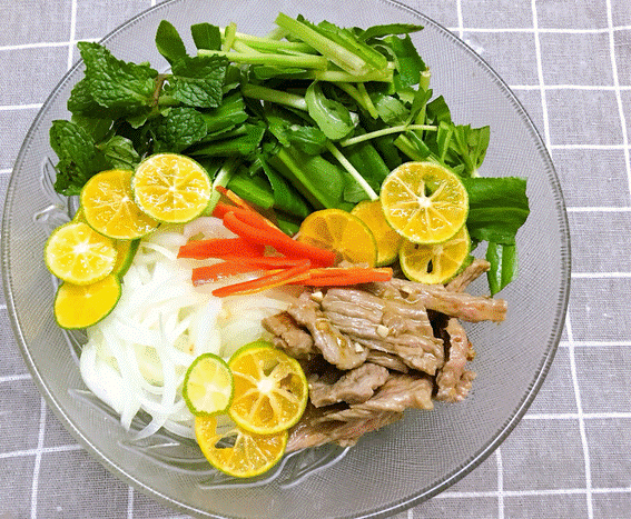 Cho phần hành tây, rau thơm, thịt bò, ớt sừng, tắc thái lát, hành tỏi phi vào tô lớn.