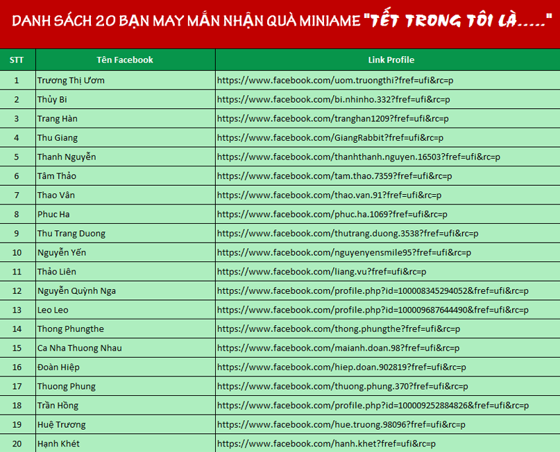 Chúc mừng 20 bạn có tên trong danh sách nhận quà nhận quà Mini game:"Senny thiên nhiên - Tết trong tôi là..." tháng 1/2017. Quà tặng sẽ được giao đến tận tay các bạn có link facebook sau: