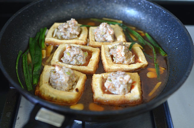 - Đổ dầu vào chảo. Chờ dầu sôi bỏ phần đậu đã nhồi thịt vào chảo. Chú ý để lửa vừa phải, rán cho miếng đậu chín vàng.