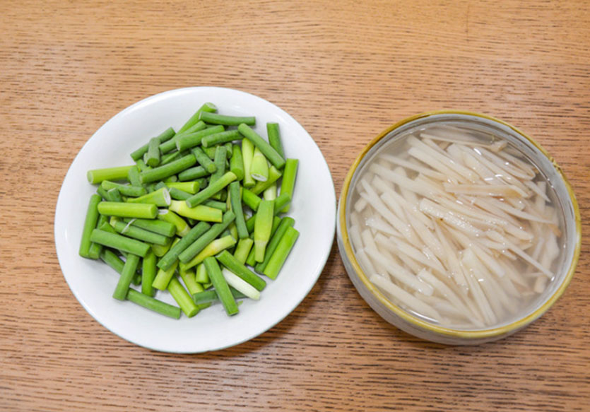 Bước 1: Rửa sạch ngồng tỏi và gọt vỏ củ sen. Cắt ngồng tỏi thành từng đoạn nhỏ, thái củ sen theo chiều của lỗ củ, sau đó thái thành dạng sợi. Ngâm củ sen trong nước lạnh có pha chút giấm trắng khoảng 15 phút. Việc này sẽ giúp củ sen giòn hơn và khử sạch tinh bột trên bề mặt, giúp khi xào sẽ không bị dính.