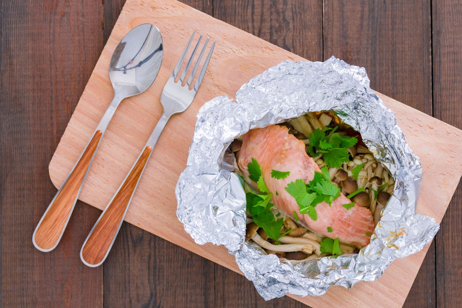 Lần lượt trải các lớp hành tây, cá hồi, nấm và cà rốt lên tấm giấy bạc