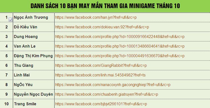 Danh sách 10 BẠN MAY MẮN tham gia Mini game Tháng 10/2016: