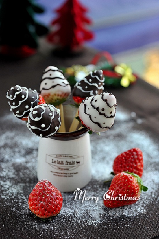 Đêm giáng sinh được coi là một đêm lạnh nhất trong năm vậy bạn hãy để những cây dâu tây chocolate ngọt ngào sưởi ấm trái tim bạn. Những quả dâu tây chín mọng ngọt nhưng pha lẫn chút vị chua nhẹ, bên ngoài dâu tây là một lớp chocolate trắng, chocolate đen với những cách trang trí ngộ nghĩnh vô cùng bắt mắt. Đặc biệt hơn, những quả dâu tây chocolate còn được cắm những chiếc nĩa tre nên nhìn rất giống những chiếc kẹo mút độc đáo. Với những que dâu tây chocolate này chắc chắn bàn tiệc giáng sinh của gia đình bạn sẽ trở nên hấp dẫn hơn rất nhiều đấy.