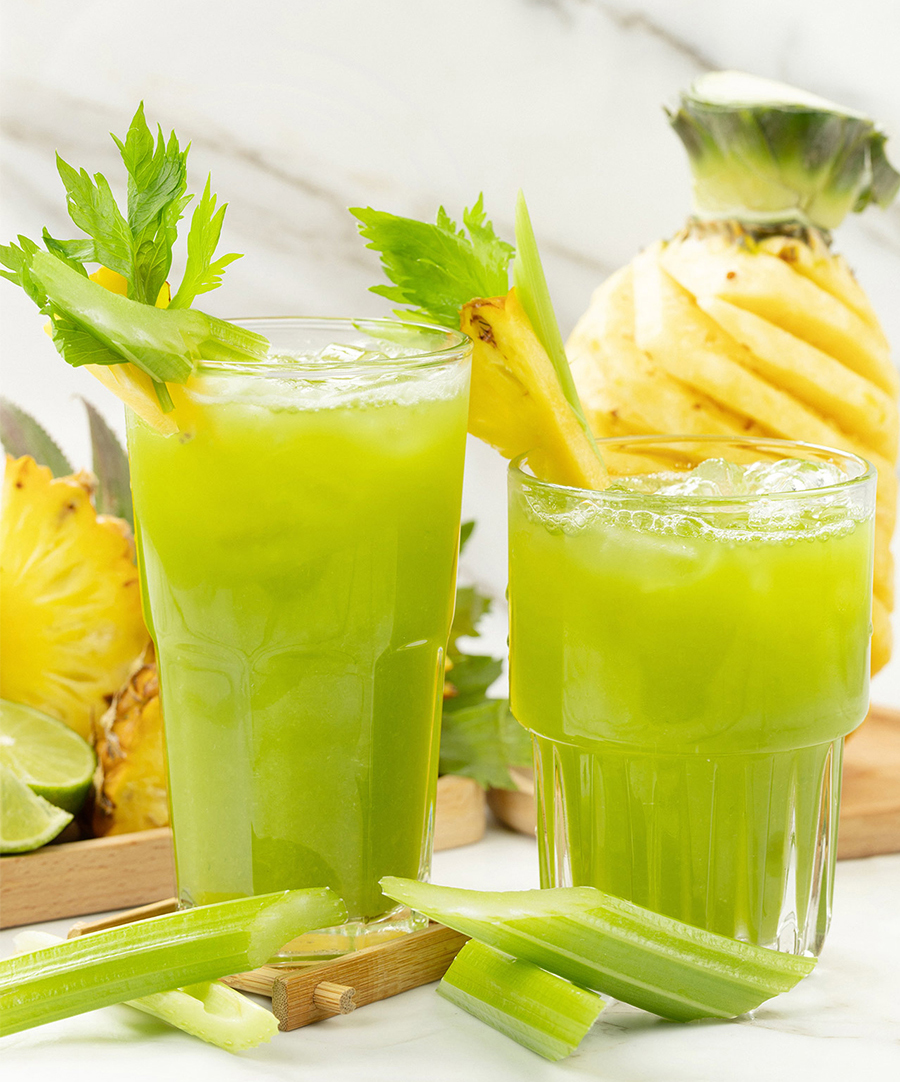 Cách làm: Bạn gọt vỏ dứa, bỏ mắt và cắt nhỏ. Rau bạc hà và cần tây rửa sạch, để ráo và cắt nhỏ. Cho các nguyên liệu vào máy ép, ép lấy nước là xong!