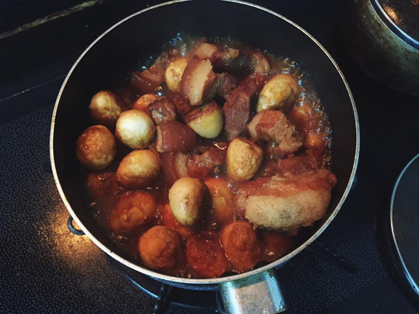 – Cho thịt lên bếp xào săn lại với lửa nhỏ, sau đó đổ nước hàng vào sấp mặt thịt, đun với lửa to cho sôi bùng lên 10 phút rồi hạ về lửa nhỏ, tới khi thịt chín thì cho trứng cút vào kho cùng. Cuối cùng, nêm lại gia vị và tắt bếp.