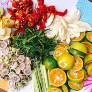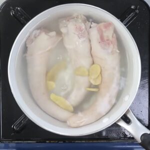 - Đuôi heo rửa sạch, chần sơ qua nước sôi với chút muối và gừng để khử mùi hôi.