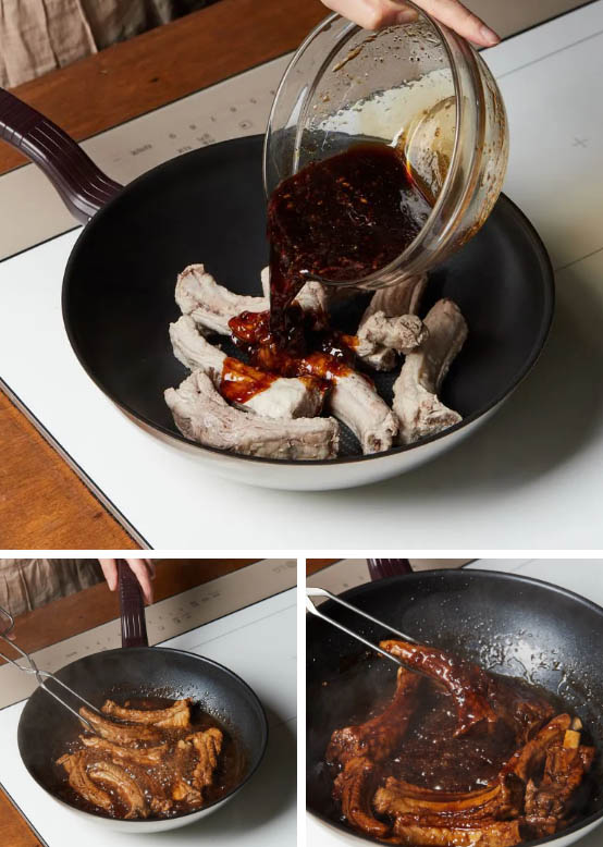Bước 2: Cho tất cả các nguyên liệu gia vị vào một tô sau đó trộn đều. Tiếp theo bạn cho sườn vào chảo, thêm phần hỗn hợp sốt gia vị và sườn luộc vào chảo rồi đun nhỏ lửa (mức lửa 5/9 của bếp từ) trong khoảng 20 phút.
