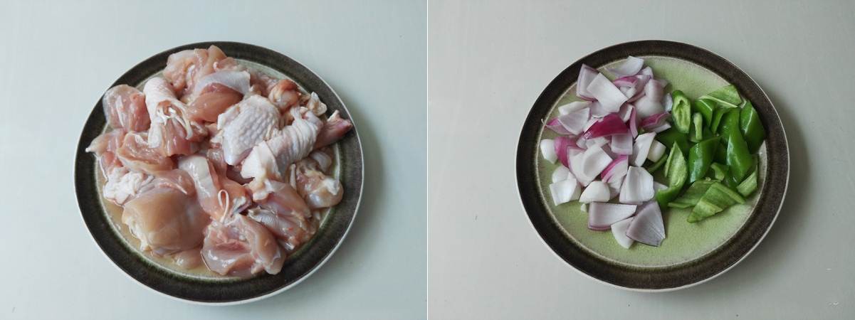 Bước 1 - Gà rửa sạch chặt miếng vừa ăn. Hành tây và ớt thái miếng.
