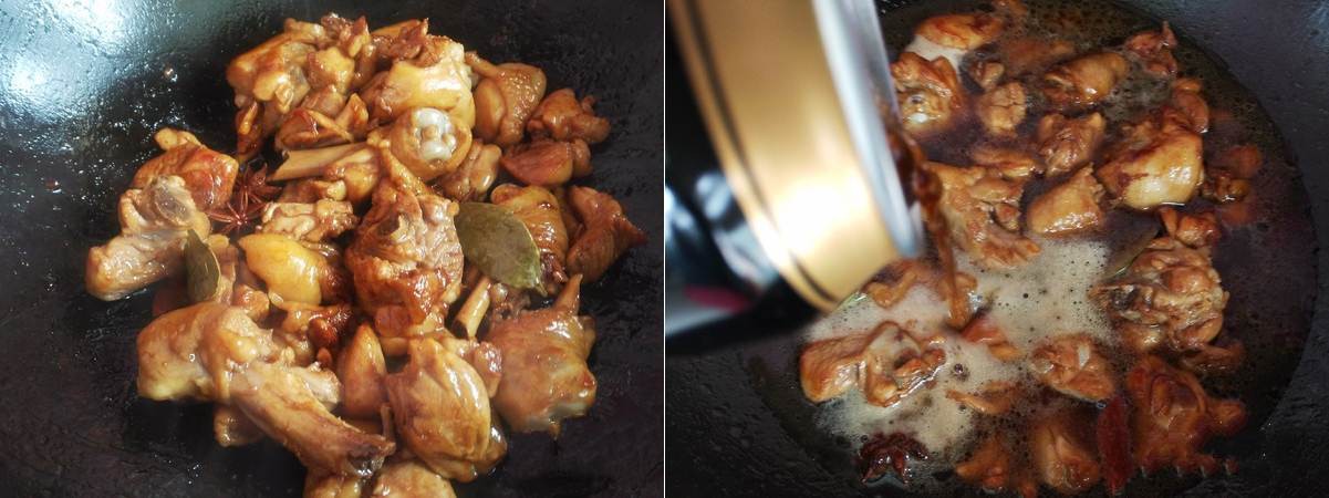 Bước 3 - Thêm nước tương nhạt, nước tương đặc, hoa hồi, lá nguyệt quế, quế và một ít muối vào chảo gà. Sau đó đổ bia vào và đun sôi nhỏ lửa khoảng 30 phút.