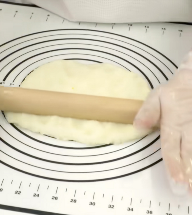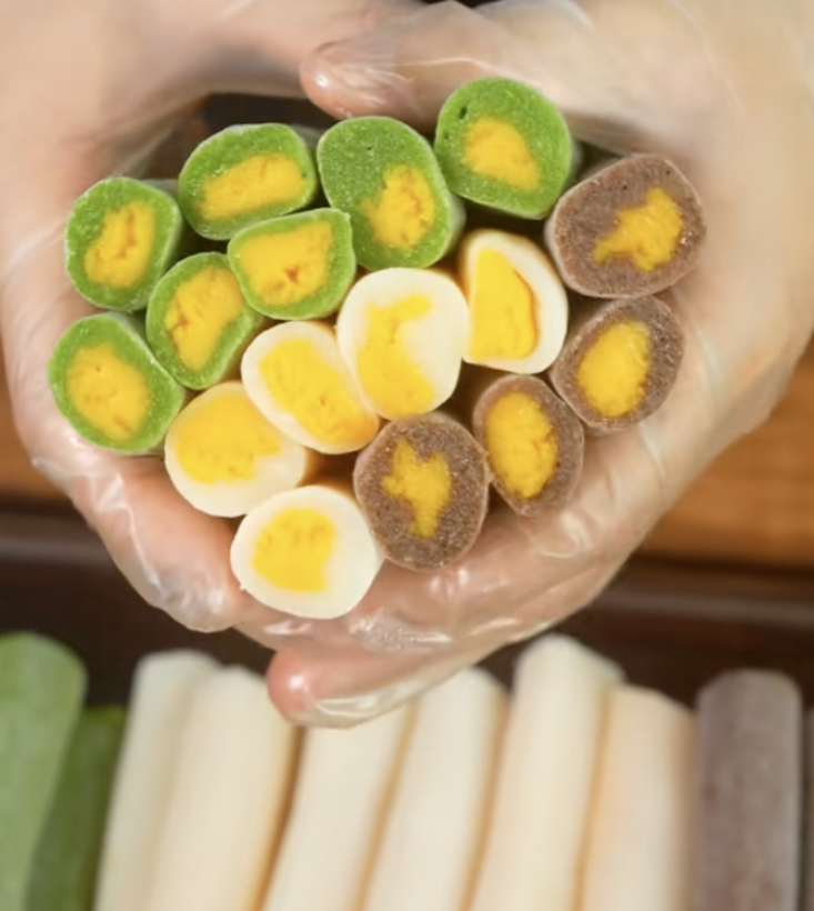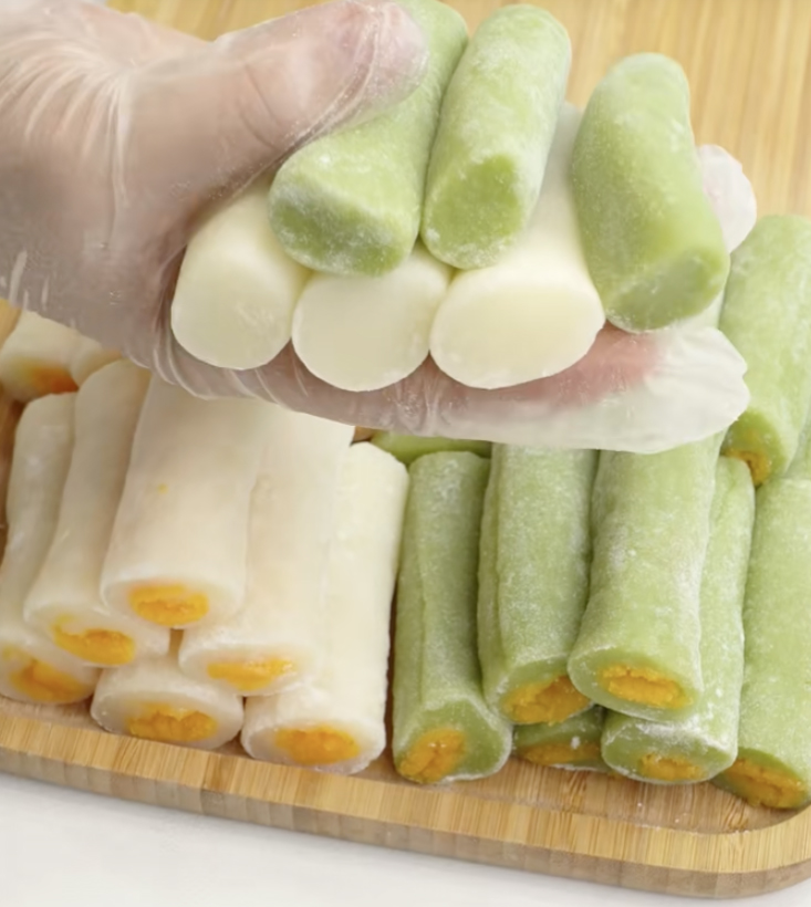 Bước tiếp theo là tạo hình, chia bột thành từng phần nhỏ, vo tròn, cán mỏng rồi đặt nhân vào giữa. Cuộn tròn lại, cắt thành từng khúc nhỏ, phủ bột chống dính và vo nhẹ để bánh mịn đẹp. Khi ăn, chỉ cần lấy từng khúc nhỏ, nhân bên trong sẽ kéo dài thành sợi cực kỳ hấp dẫn.