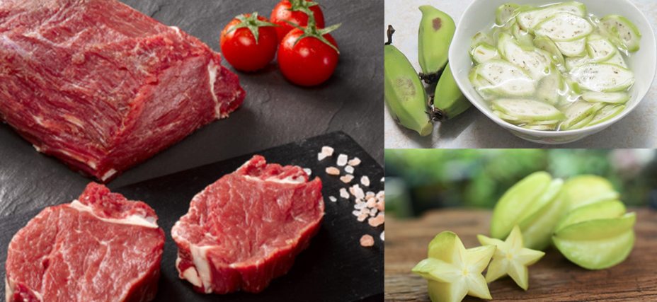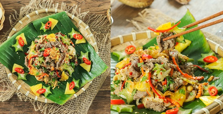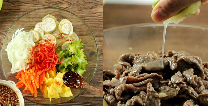 Lấy 1 tô lớn hay thau nhôm, cho chuối chát, khế chua, thơm, cà rốt, hành tây, ớt sừng thái sợi vào. Rưới nước mắm trộn gỏi lên, trộn đều. Tiếp theo cho thịt bò, 30ml nước cốt chanh vào trộn lên lần nữa.