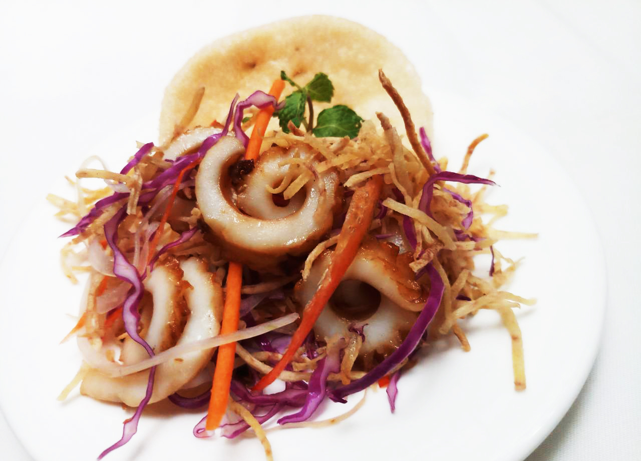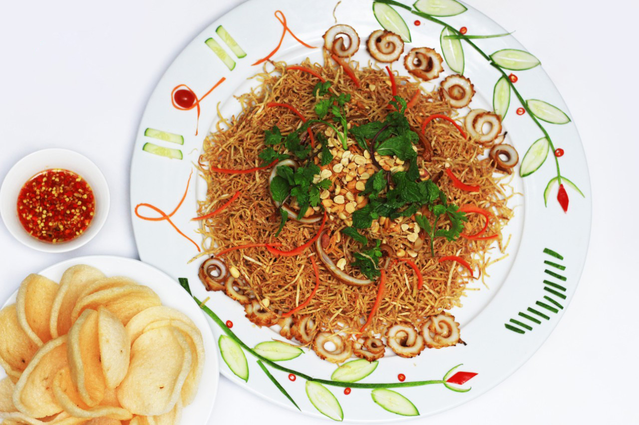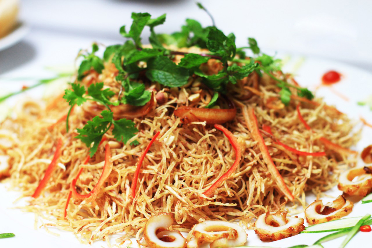Món gỏi khoai môn ngọt bùi của khoai môn kết hợp với dai giòn sần sật của mực, đặc biệt của món gỏi này là khoai môn được xắt sợi và được chiên giòn tan, trộn với cà rốt, bắp cải tím thanh mát. Chắc hẳn món gỏi này sẽ rất tuyệt vời lạ miệng cho cả gia đình!