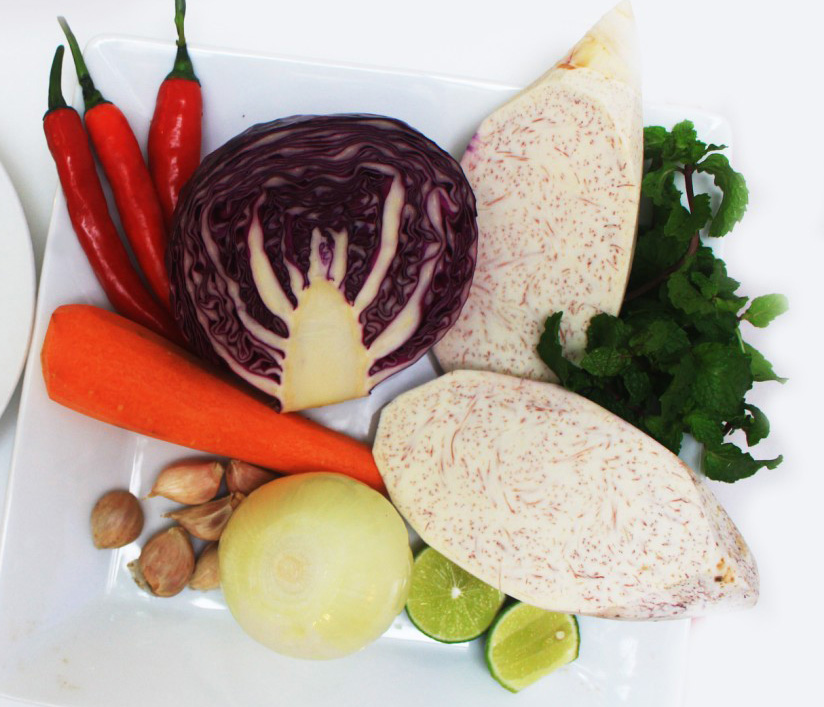 Với khoai môn, các bạn làm sạch vỏ và thái thành sợi nhỏ. Hành tây rửa sạch thái mỏng, tương tự với khoai môn, cà rốt, bắp cải tím các bạn làm sạch và thái thành hình sợi nhỏ.