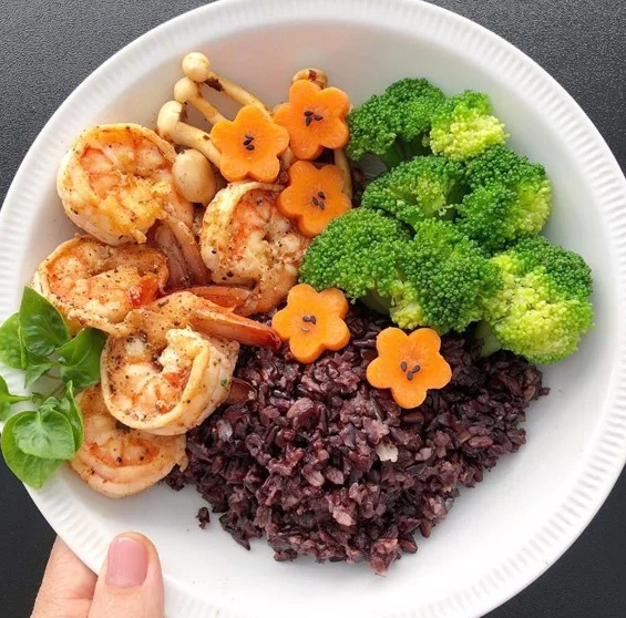Cơm gạo lứt, tôm, bông cải xanh, cà rốt, nấm