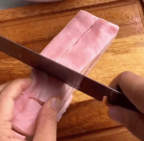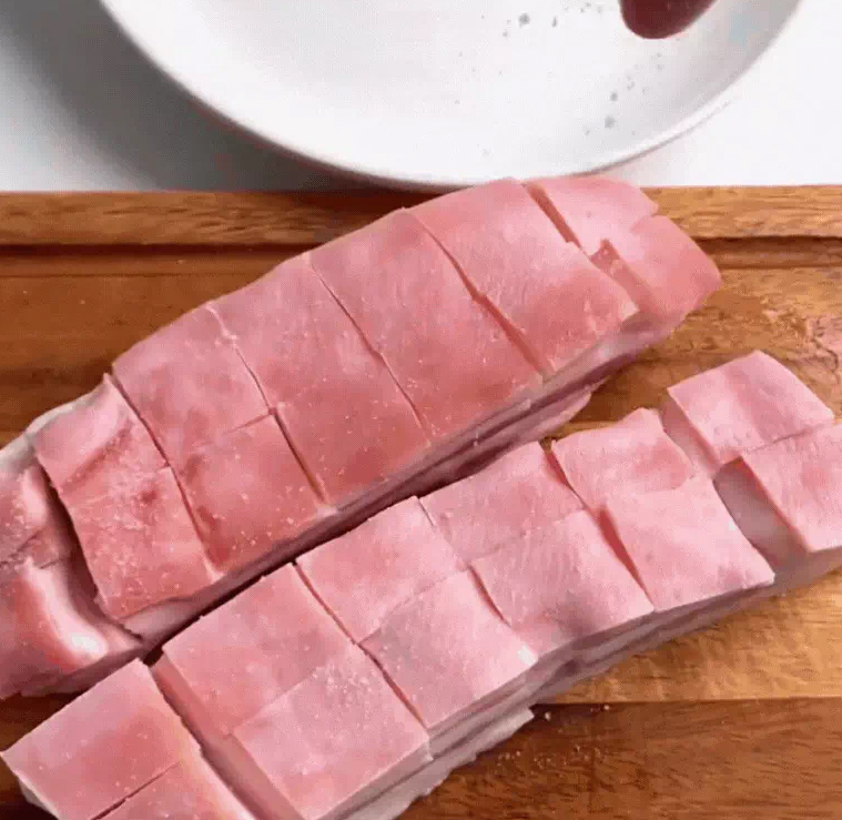 Cắt thịt ba chỉ, khía từ phần da xuống theo chiều dọc rồi chuyển sang chiều ngang theo các miếng vuông.