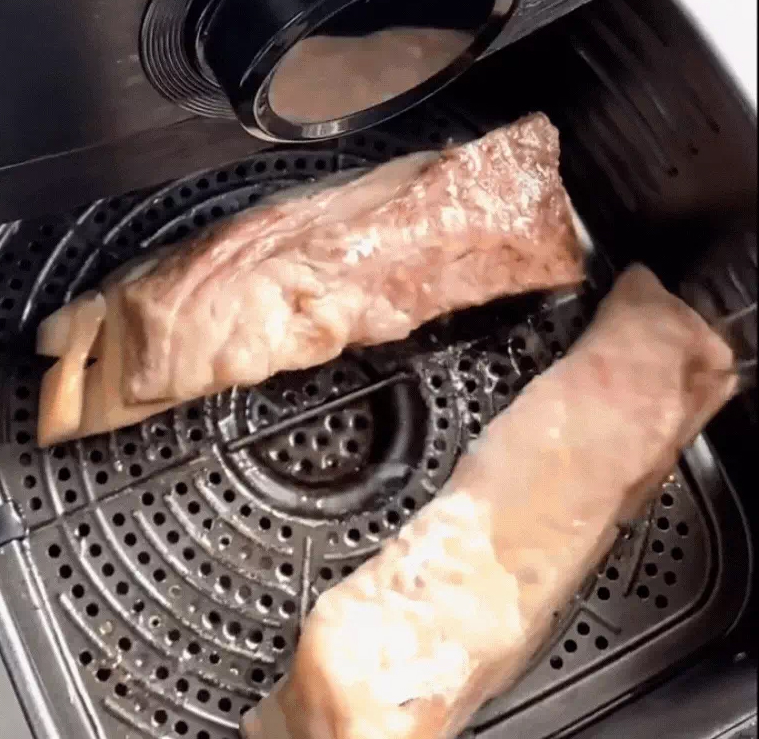 Cho thịt vào nồi chiên không dầu để nhiệt độ 100 độ C trong khoảng 30 phút. Sau đó, nướng lần 2. Tăng nhiệt độ lên 200 độ C trong vòng 15 phút.