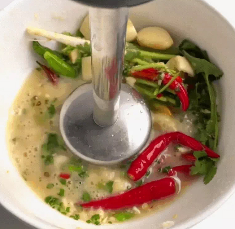 Cho hỗn hợp vào máy xay gồm ớt tươi, tỏi, rau mùi, đầu hành trắng, đường thốt nốt, nước chanh, muối trắng, nước tương. Xay nhuyễn.