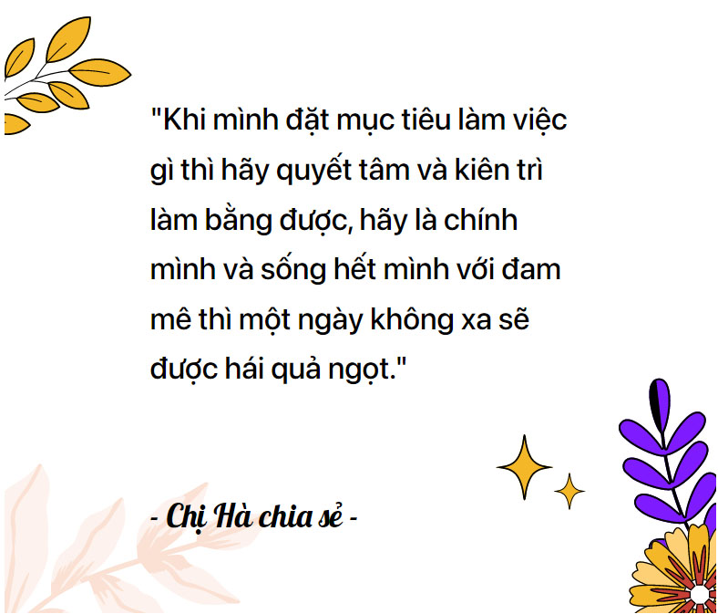 Hà chia sẻ: "Mình sinh ra ở một làng quê nghèo tại Thái Nguyên. Khi đó, điều kiện gia đình còn khó khăn nên khi mới 15 tuổi mình phải từ bỏ ước mơ được đến trường. Mình vào TP.HCM để đi làm phụ bố mẹ nuôi em ăn học. Lúc đó, mình đã tự hỏi mình sẽ phải làm sao để trụ lại giữa thành phố này?" - chị Hà kể về câu chuyện cuộc đời mình.