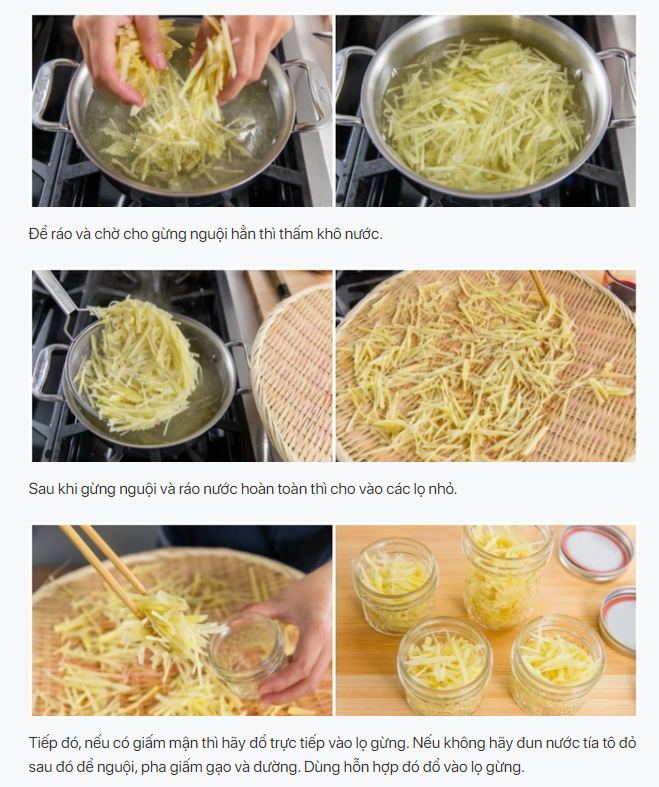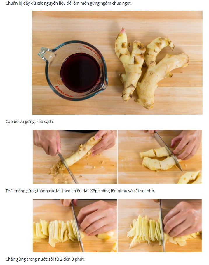 Gừng ngâm chua ngọt được làm từ những nguyên liệu tự nhiên nhất và không dùng phẩm màu. Gừng non thái sợi mỏng, ủ trong giấm gạo hoặc giấm mận. Màu đỏ tươi của gừng ngâm được lên màu từ củ dền hoặc lá tía tô đỏ. Trong công thức gừng ngâm chua ngọt dưới đây sẽ dùng lá tía tô để tạo màu cho gừng.