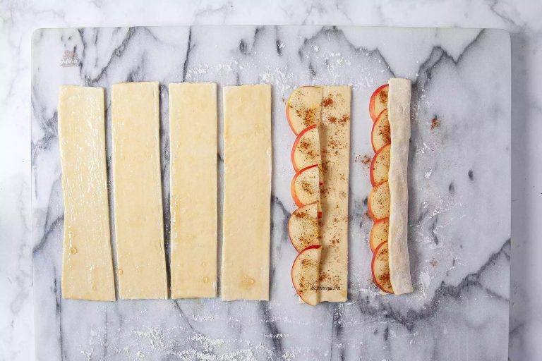 Gấp phần dưới cùng của miếng bột lên, sau đó bắt đầu từ một đầu, cẩn thận cuộn miếng bột lại, giữ nguyên các lát táo. Bịt mép ở cuối bằng cách dùng ngón tay ấn nhẹ.