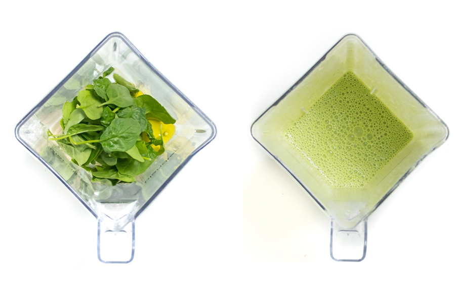 1. Cho vào máy xay sinh tố: rau cải bó xôi, đường, sữa hạnh nhân. Xay mịn tất cả.