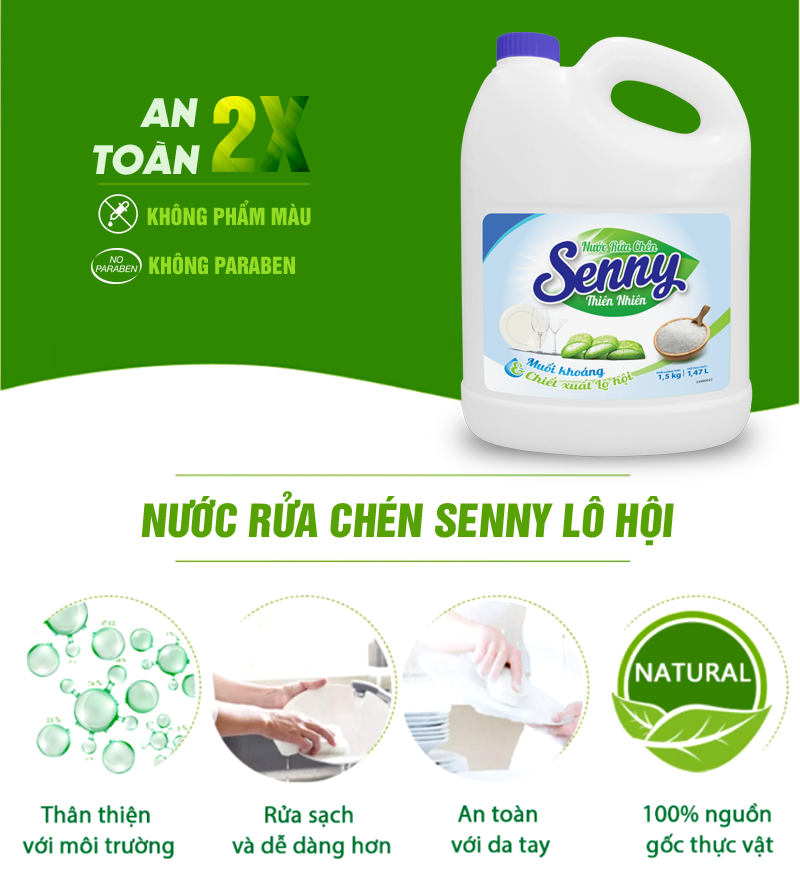 Senny lôi hội an toàn cho da tay, giúp làm yếu liên kết dầu mỡ, làm sạch bát đĩa nhanh