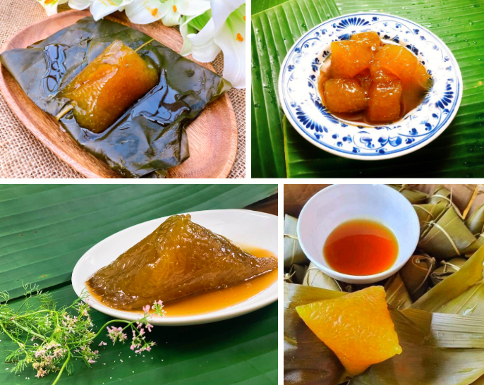 Bánh gio mật mía có quanh năm nhưng vào ngày 5/5 âm lịch, món bánh này được dâng kèm trong mâm lễ. Bánh gio được làm từ gạo nếp rẫy vừa dẻo lại thơm, gói từ lá chít bánh tẻ giúp bánh có màu vàng hổ phách đẹp lại dễ bóc. Khi ăn, bánh có mùi thơm đặc trưng.