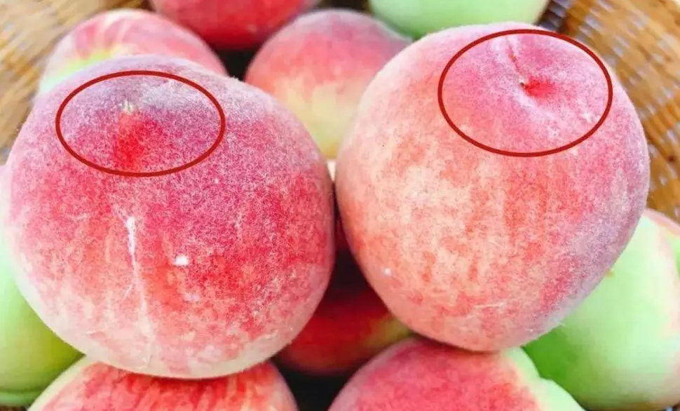 Phần đáy đào sẽ tiết lộ quả đào chín hay chưa. Nếu phần dưới này màu đỏ hồng, nghĩa là quả đào đã chín hoàn toàn. Nếu có màu trắng hoặc xanh là đào chưa chín, bạn không nên mua.