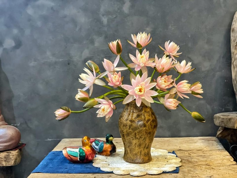 Chị Hà Lê chia sẻ thêm: "Mình rất thích hoa súng vì thơm đẹp, thanh tao. Chinh phục hoa nở khá cầu kỳ, hoa súng cũng thức và ngủ như con người vậy, cắm hoa súng cũng rèn tính kiên trì và chịu khó".