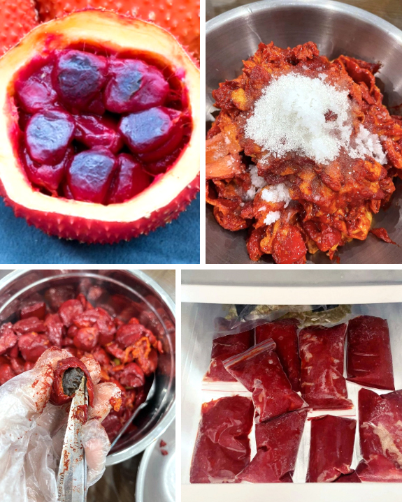 Chị em mua gấc về, bổ gấc tách lấy thịt ra khỏi quả. Thêm xíu phần cùi vàng để tăng độ ngậy. Dùng kéo nhọn tách phần hạt gấc ra để riêng. Thịt gấc sau khi tách hết ra cho thêm muối trắng, đường và dầu ăn cùng rượu trắng theo tỷ lệ 1:2:3:3:3 (cứ 1 cân thịt gấc thì cho 2 thìa muối, 3 thìa đường, dầu ăn và rượu trắng). Xay nhuyễn tất cả. Cho dầu ăn để gấc khi rã đông không bị khô.